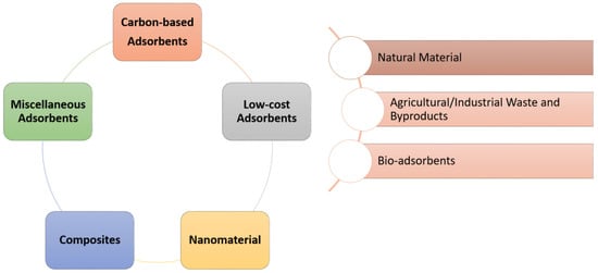 Adsorption is the use of solids to eliminate substances from gaseous and liquid solutions. Activated carbon, metal hydrides, and synthetic resins are common adsorbents used in water and wastewater treatment plants []. The most common adsorbent categories for water treatments are presented in Figure 9. Comparing several water treatment methods for heavy metals removal (Table 7) shows that adsorption is more affordable than membrane technologies, simpler, and more secure to deal with than contaminated sludge produced by precipitation, and it is multipurpose in contrast to ion exchange []. The main limitation of the adsorption method is that its effectiveness is affected by the presence of other ions. Various ions compete for the adsorbent’s active site, affecting the adsorption capacity []. For example, phosphate ions can compete with As ions due to their similar chemical structure; thus, they can significantly lower the As removal efficiency (Gallegos-Garcia et al., 2012). The presence of 10 mmol L−1 H2PO42- decreased the adsorption efficiency of As(III) on zero-valent iron nanoparticles from 99.9% to 66.3% [].
