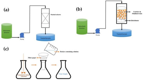 Different configurations for adsorption of impurities: (a) Packed-bed adsorber, (b) Fluidized-bed adsorber, and (c) Batch experiments.