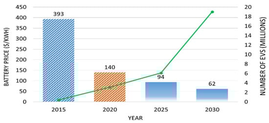 Electric vehicles (EV) have emerged as a promising form of sustainable transportation and pollution lowering [1]. The electrified transportation using electric energy storage systems, electric machines, and power electronic converters are improving their technologies at a rapid pace to provide much higher efficiencies. Therefore, the increased use of battery electric vehicles can provide many benefits that include potential independence from oil, reduction of vehicle emissions, and vehicle-to-grid (V2G) technology. Following the prediction from the Lawrence Berkeley National Laboratory (California, USA), the number of electric vehicles will be 6.1 million in 2025 and increase to 19 million vehicles in 2030. The price of an electric vehicle battery will reduce to $62/kWh in 2030 [2], as shown in Figure 1.