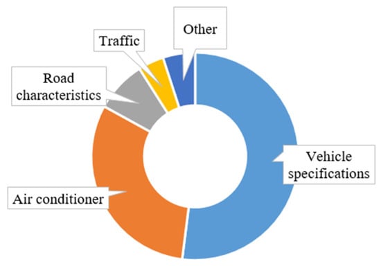 To provide a high accuracy estimation model, the primary factors influencing the EV’s energy consumption must be carefully selected. Aside from the vehicle specifications that impacts the most, the energy consumption of the EV varies significantly as a result of various factors such as driving style, road characteristics, traffic, which can be represented by the energy consumption of the driving power, power brake, and power steering, and weather conditions, which can be represented by the energy consumption of the air conditioner [19,20]. Several studies have been conducted based on the construction of the electric vehicle to determine the elements that affect the energy consumption of the EVs. The authors of [21] estimated the energy consumption of an EV using a simple binary model and then identified the main parameters affecting the EV’s energy consumption. The main factors are vehicle specifications, driver behavior, road characteristics, air conditioner (AC) and weather conditions. An investigation from Idaho National Laboratory also agreed that the main factors are vehicle specification and AC. The other components only have little affect [22]. Based on the investigation from the literature, the factors that affect EV’s energy consumption are demonstrated in Figure 2.