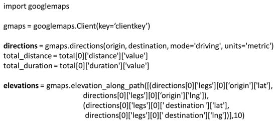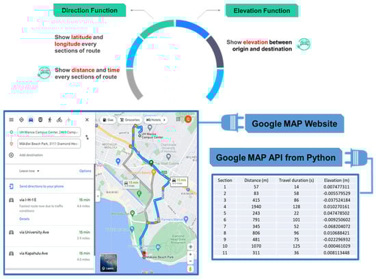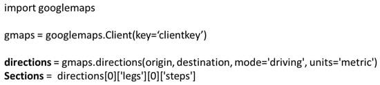 Normally, the energy consumption can be predicted using the averge travel distance and averge route elevation. However, each different road segment will have a different elevation and speed limit. If the car is traveling downhill, it will need to use the break to slow down, so the travel time will be longer. If the car is traveling uphill, the car will need to consume more energy to accelerate the vehicle. In the residential area, the speed limit is 25 mL/h, so the EV’s energy consumption is also different compared to traveling in the highway [24,25,26]. Through the Google Maps, each EV’s travel route are divided into small sections based on street information and travel directions. The model will collect information of these sections and do energy estimation for each sections to increase the accuracy of the estimated model. The sections information can be obtained by using the following commands, as shown in Figure 5 [27]:
