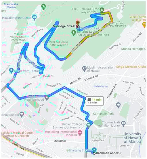 Test 1: Driving test in Oahu island, Hawaii from University of Hawaii at Manoa (21.297673, −57.820036) to Tantalus Lookout (21.314080, −157.822237). The vehicle’s energy consumption is significantly influenced by the elevation of the route due to the high slope of this road and the need to constantly accelerate to reach the peak. The travel route of the EV is shown in Figure 7.