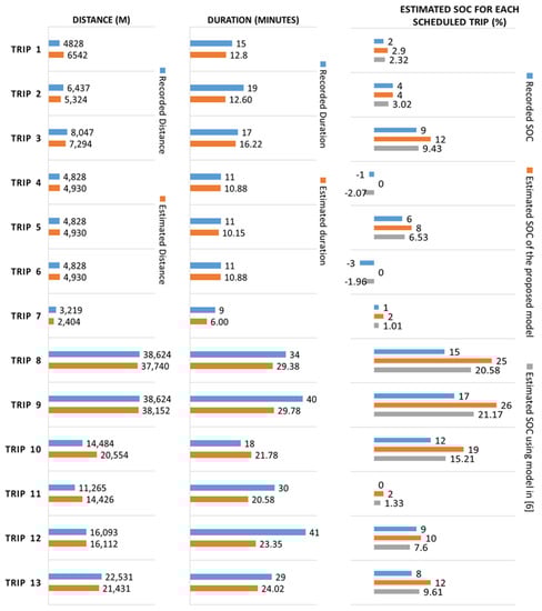 Figure 3 shows that the predicted distance for trips based on data provided by Google Maps is quite accurate. The MAPE of distance estimation is 13.25%. However, depending on traffic conditions and driving behaviors, the travel time of each trip may differ from the prediction. The MAPE of travel duration estimation is higher, at 22.65%. As the estimation does not account for uncertainty changes in reality, the target of the proposed model is to cover energy consumption for the whole trip with an acceptable level of redundancy to save user’s charging expenses. Instead of charging full the battery at a high price time, the user can choose to charge enough for the trip and charge more later at a lower price time. The estimated SOC change for each trip will be evaluated based on the number of times the estimation results are matched or higher than the recorded data. The comparison results are shown in Table 6.