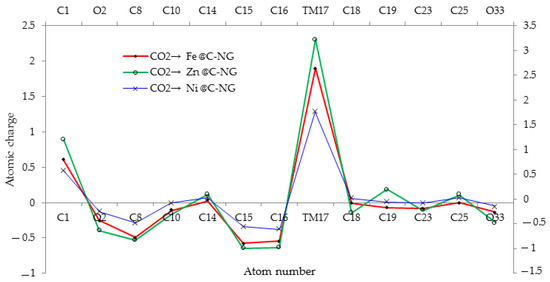 The fluctuation of charge distribution versus atom number for adsorbing CO2 on the (Fe, Ni, Zn)@C- GR.