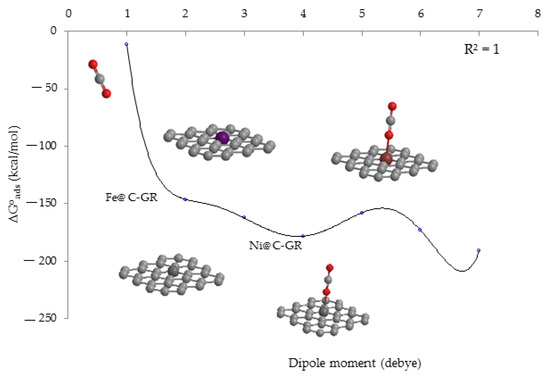 The changes of Gibbs free energy (kcal/mol) versus dipole moment (Debye) for adsorption of CO2 on the (Fe, Ni, Zn) embedding of C-nanographene surfaces.