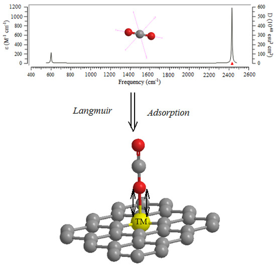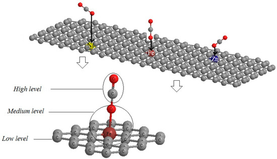 2 in the adsorption zone. A medium-degree level has been considered on the other carbon atoms of nanographene in the adsorption zone owing to semi-empirical methodologies. At last, a low-degree level has been depicted on the other iron, nickel, zinc, manganese, cobalt and copper atoms through adsorption of CO