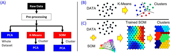 Schematic of the data analysis workflow implemented in this study: (A) PCA, K-Means and SOM unsupervised learning techniques were applied; (B) cluster calculation by K-Means algorithm and (C) cluster calculation by SOM algorithm.