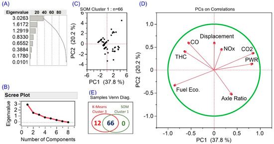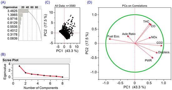 PCA trends in SOM Cluster 1. (A) Eigenvalues and their proportions, (B) scree plot of eigenvalues, (C) score plots of the samples on the PC1 and PC2, and (D) loadings plot of the variables on PC1 and PC2. Note that the originators of the data samples clustered in SOM Cluster 1 are the vehicle manufacturers that independently conduct the fuel economy and emissions tests. LDVs model year is 2022.