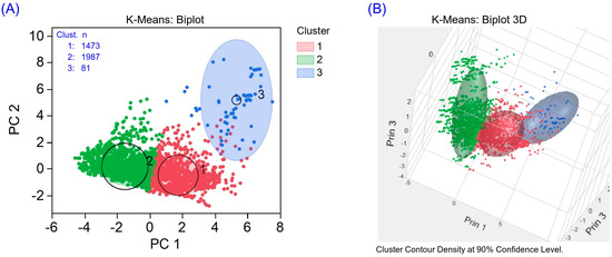 Optimal clusters identified through K-Means clustering. (A) Clusters projected on the first two PCs-PC1 and PC2, and (B) clusters projected on the first three PCs-PC1, PC2, and PC3. LDVs model year is 2022.