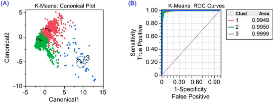 The results of K-Means clustering are shown in Figure 3 and Figure 4. The optimal number of clusters, which was found to be three, resulted in distinct segmentation of the whole dataset. A visual representation of the segmentation is evident in Figure 3, which shows the projection of the cluster-coded samples onto the first two PCs (Figure 3A) and onto the first three PCs (Figure 3B). The results of LDA on these three clusters (Figure 4) confirmed that the three clusters achieve a very high area under the ROC (AUC), which is in the range 0.9949–0.9999. AUC is the probability that a classifier will rank a randomly chosen positive instance higher than a randomly chosen negative one, with AUC = 1.0 being a perfect classifier and AUC = 0.5 being a uniformly random classifier [14]. Hence, the three clusters from the K-Means clustering meet the requirements for a set of good segmentation planes for the dataset. The classification scores of these three clusters are summarized in Table 2. The prediction rates of the three clusters are close to one, with an overall percent misclassification of only 3.22%. The trends within each of these clusters were then examined using PCA (Figure 5).