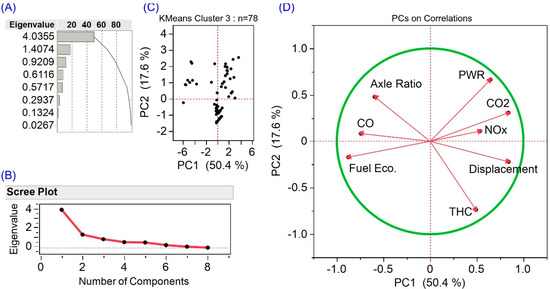 PCA trends in K-Means Cluster 3. (A) Eigenvalues and their proportions, (B) scree plot of eigenvalues, (C) score plots of the samples on the PC1 and PC2, and (D) loadings plot of the variables on PC1 and PC2. Note that the originators of the data samples clustered in K-Means Cluster 3 are the vehicle manufacturers that independently conduct the fuel economy and emissions tests. LDVs model year is 2022.