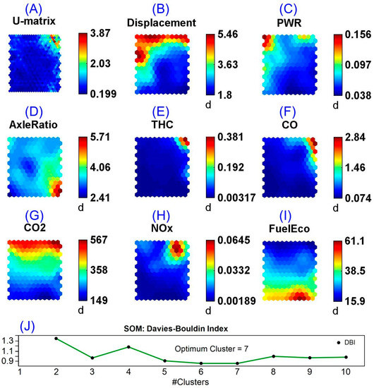 Performance of SOM in training on the input dataset. The optimal cluster number based on the Davies–Bouldin index (minimum) is seven clusters. The rendered maps are the denormalized values of variables (denoted by “d”) in their original units. LDVs model year is 2022.