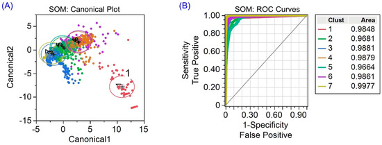 The results of SOM clustering are shown in Figure 6 and Figure 7. A unique set of results from SOM are the projections of the variables onto component planes (Figure 6B,I) after the SOM model training on the dataset. These are visual renderings of the relative levels of the variables at a specific neuron position (a unit cell on the map) on the maps. The U-matrix, or unified distance matrix (Figure 6A), represents the Euclidean distance between the codebook vectors of neighboring neurons, and the high values in the map indicate regions of samples of distinct attribute levels [17]. The optimal number of clusters for the model year 2022 dataset was seven, which resulted in the minimum DBI during the SOM clustering (Figure 6J). Unlike the K-Means, which showed very distinct segmentation of the dataset on a 2D canonical plot, SOM produced a set of clusters that have some overlaps when projected onto the first two canonical variables in the LDA (Figure 7A). This is expected, as the number of SOM clusters is greater than the first few canonical variable representations. Nonetheless, the AUCs of the seven SOM clusters were in the range of 0.9664-0.9977 (Figure 7B), which are still high AUC values [10]. The classification scores of these seven SOM clusters, which are in the prediction rate range of 0.794–0.955 (Table 3), are not as high as those of K-Means and have an overall percent misclassification of 14.72%.