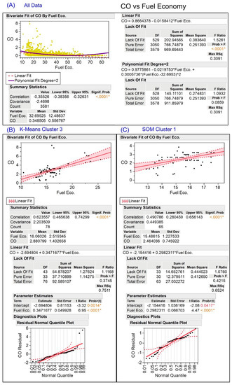 Among the various clusters determined, Cluster 3 from K-Means and Cluster 1 from SOM showed peculiar trends regarding the relation of CO emissions to Fuel Economy. A bivariate analysis of this relation was done to determine summary statistics and model fitting. Figure 9 shows a summary of the results for the whole dataset samples (Figure 9A), K-Means Cluster 3 samples (Figure 9B), and SOM Cluster 1 samples (Figure 9B). These results show that the correlation of CO emissions and Fuel Economy is statistically different between the calculation on the whole dataset and the calculation on the clusters. The direction of proportionality changes from negative correlation r = (−) 0.355 (Figure 9A) on the whole dataset to a positive correlation on the clusters; r = (+) 0.62 on K-Means Cluster 3 (Figure 9B) and r = (+) 0.491 on SOM Cluster 1 (Figure 9C). Model fitting on the data was also done to test the null hypothesis that the slopes of proportionality are zero, which would mean no functional linear relation between CO and Fuel Economy. Rejecting this null hypothesis would mean the slopes are statistically different from zero, which eliminates the possibility of random errors causing the correlations. The calculated slopes of the linear models fitted to the clusters data are different from zero; they are 0.347 CO (g/mi)/MPG and 0.298 CO (g/mi)/MPG for K-Means Cluster 3 and SOM Cluster 1, respectively, with [Prob>|t|] less than 0.001 at a 5% significance level (Figure 9B,C). In addition, the lack-of-fit test was done to confirm the fitting performance of the models; it tested whether the lack-of-fit error is zero (equivalently means significantly smaller than pure error) [14]. With F-statistic probabilities [Prob>F] = 0.0.2349 and 0.4215 for K-Means Cluster 3 and SOM Cluster 1, respectively, the lack-of-fit test cannot reject the null hypothesis at a 5% significance level, which means that the lack-of-fit error is statistically zero. This confirms the inference that the linear models for CO vs. Fuel Economy statistically fit the data in each cluster. These results mean that when looking at the whole dataset, the statistical inference is that the CO emission decreases with Fuel Economy. On the other hand, when looking at the two clusters, K-Means Cluster 3 and SOM Cluster 1, the statistical inference is that CO emission is increasing with increasing Fuel Economy.