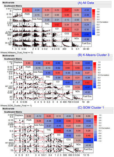There are other notable trends seen on the whole dataset and on the K-Means Cluster 3 and SOM Cluster 1 as shown by the multivariate correlation graphs in Figure 10. Power-to-weight (PWR) and Fuel Economy correlation values are close to each other, with negative values r = (−) 0.49, r = (−) 0.53, and r = (−) 0.53 for the whole dataset, K-Means Cluster 3, and SOM Cluster 1, respectively. This means an increasing PWR results in decreasing Fuel Economy whether considering the whole dataset or the clusters. On the other hand, the PWR shows a change in direction of correlation with CO when analyzed from the whole dataset compared to the clustered dataset. PWR and CO have almost negligible correlation if analyzed in the whole dataset, with r = (+) 0.06, but they have a negative correlation, seen in values r = (−) 0.52 and r = (−) 0.64, in K-Means Cluster 3 and SOM Cluster 1, respectively.