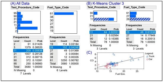 Distribution of data in the whole dataset (A) and the K-Means Cluster 3 (B) according to the Test Procedure and the Fuel Type used during testing. The level codes for the procedure and the fuel are based on the US-EPA codes. LDVs model year is 2022. The diagonal hashes on the bars in (A,B) visually indicate the features levels associated with the selection of the Fuel Type level 26 in the K-Means Cluster 3 (B). Subplot (C) is a bivariate plot of CO and Fuel Economy with datapoint legend for trucks and cars to show the locations of the K-Means Cluster 3 data relative to the linear model fit.