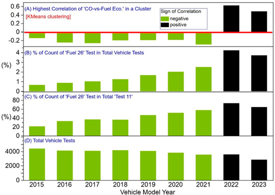 The potential effects of Fuel Type and Test Procedure, specifically “Fuel 26” and “Test 11” in the US-EPA emissions test standards, on the positive correlation of CO vs. Fuel Economy. (A) The highest correlation value of CO vs. Fuel Economy in a cluster after applying K-Means clustering; (B) percentage of number of tests that used Fuel 26 in the whole dataset from a vehicle model year; (C) percentage of number of tests that used Fuel 26 in the Test Procedure 11; (D) the total number of LDV tests in the dataset for a model year.