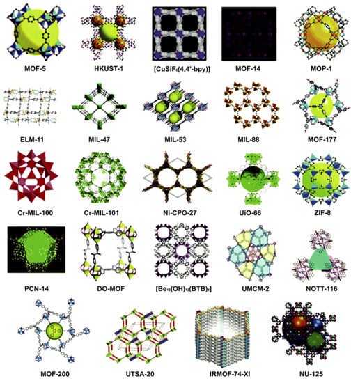 - Furukawa, H.; Cordova, K.E.; O’Keeffe, M.; Yaghi, O.M. The Chemistry and Applications of Metal-Organic Frameworks. Science 2013, 341, 1230444. [Google Scholar] [CrossRef]