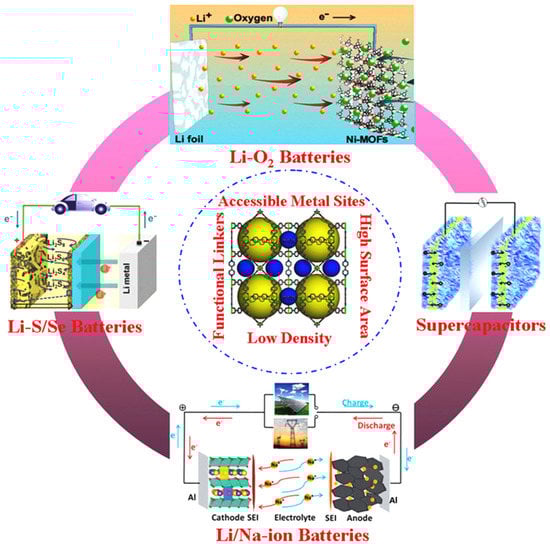 - Baumann, A.E.; Burns, D.A.; Liu, B.; Thoi, V.S. Metal-organic framework functionalization and design strategies for advanced electrochemical energy storage devices. Commun. Chem. 2019, 86, 2. [Google Scholar] [CrossRef]