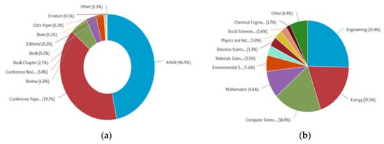 Distribution of document types and subject areas of the published documents on MLARE research (2012–2021). (a) Distribution of various document types used by various authors on MLARE (b) Distribution of various subject areas in the research of MLARE.