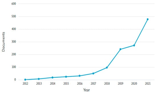 It is widely reported that multidisciplinary research provides multiple approaches to problem-solving, which is crucial for the growth and development of scientific research. In addition, the multidisciplinary approach to science reportedly eliminates the likelihood of repetitive or biased outcomes, which enhances the reliability and accuracy of research on the whole []. However, this has prompted questions such as whether or not interdisciplinary research teams ensure higher output in science, as examined by Abramo, D’Angelo et al. []. In a separate study, Abramo, D’Angelo et al. [] examined the impact of multidisciplinary collaborations on the diversification of research. Their results revealed that research diversification through collaborations with multidisciplinary teams enhances researchers’ output particularly when this occurs in larger differentiated groups. Therefore, the high variation in subject areas of the studies on MLARE indicates high rates of collaboration among the various engaged in this topical area of research. The considerable expansion in the number of published documents and citations on the subject over the 10-year period investigated in this study may also be attributed to the high frequency of multidisciplinary studies and collaborations indicated for MLARE investigations. Figure 2 displays the publication growth trends for published documents on MLARE research from 2012 to 2021. The plot of published documents against the year of publication showed an incremental trend, from 1 to 479 published documents between 2012 and 2021, which indicates an immense growth rate of 47,800%. However, the apparent growth in scientific interest in MLARE was slow in the first five years from 2012 to 2016 with <50 documents per year (i.e., 6.65% of the total publications) published compared to the years from 2017 to 2021. The findings indicate significant growth as well as interest in the area which may be due to an increase in the socio-economic and environmental impacts of the topic.