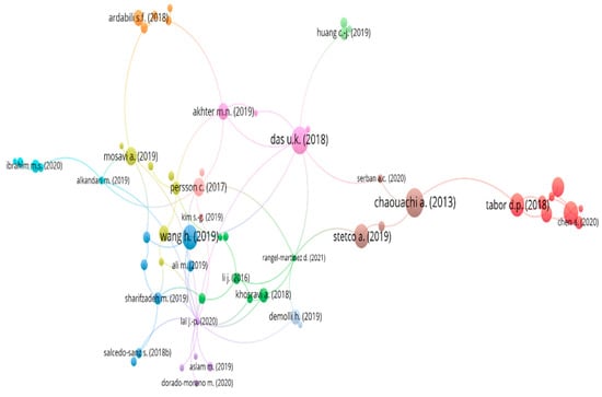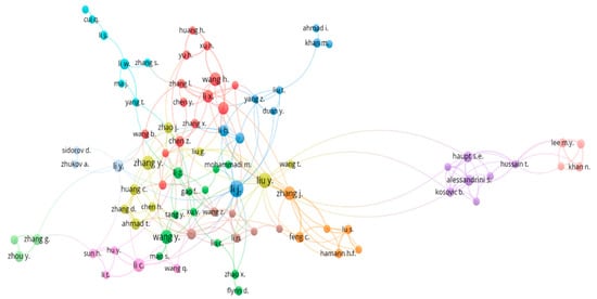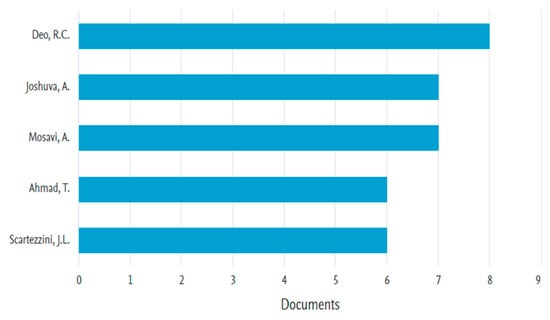 Figure 6 displays the top authors/researchers on MLARE research based on data recovered from the Scopus database. The analysis of the top researchers provides an indication of the most prominent and promising stakeholders in any given field of research []. As observed, the most prolific researcher, as defined by several published documents, is Ravinesh C. Deo based at the University of Southern Queensland (Australia) with eight publications. In second and third places are Joshuva A. Dhanraj of the Hindustan Institute of Technology and Science (India) and Amir Mosavi of the Technische Universität Dresden (Germany), each with seven publications. Lastly, the duo of Tanveer Ahmad (Kyushu University, Japan) and Jean Scartezzini (Ecole Polytechnique Fédérale de Lausanne, Switzerland) are in fourth and fifth places, respectively, with six published documents each. Furthermore, it was observed that the top 10 most prolific authors on the topic have published a total of 59 documents or ~4.84% of the total publications on MLARE research over the 10 years. Based on the high productivity of these select authors, these are the most prominent authors in the field. High research productivity, as measured by high publication rates, is often recognized as the product of numerous favorable factors such as the availability or access to scientific resources such as grants, equipment, or infrastructure that supports intellectual growth and technological development. As observed, the top five most prolific researchers are based on organization for economic cooperation and development (OECD) or Western nations such as Australia, Japan, Germany, and Switzerland, which are traditionally significant funders of research. The research and scientific climate in these regions may also be an important dynamic in the productivity of the researchers through collaborations with their peers. The extent or degree of collaborations can be examined through co-authorship analysis using bibliometric analysis. In this research work, the co-authorship among authors who are passively engaged in MLARE research was investigated using VOSViewer software (Version 1.16.17). The VOSViewer was released by Nees Jan van Eck and Ludo Waltman from Leiden University, Netherlands.