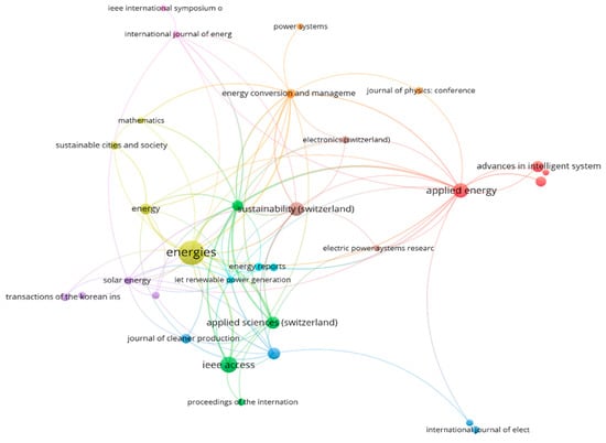 As observed in Figure 5, co-citations among the source titles on the topic are high, as shown in the high rate of linked sources, i.e., 31 out of 39 or 79.49%. Based on the findings, a total of nine clusters comprising two to four sources with the largest containing Applied Energy, Advances in Intelligent Systems, and Energy and AI, whereas the smallest has IEEE Int Symposium and International Journal of Energy. The highest TLS of 52 was observed for Energies, which is followed by Renewable and Sustainable Energy Reviews (RSER) (43), and lastly Applied Energy (26). These findings indicate the most influential journals based on the citation analysis are Energies, RSER, and Applied Energy, which indicates that the journal’s reputation, impact factor and prestige play an important role in the citation rate and the author’s preference for presenting their findings in these source titles.