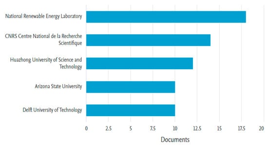 The degree or extent of collaborations between authors is also influenced by institutional policies. Ye, Song et al. [] reported that research networks across institutions can significantly influence researchers’ performance. Likewise, Adams et al. [] discovered evidence that institutional collaborations strongly influence scientific output as well as reputation. Hence, the impact of institutions on the productivity of researchers in the field of MLARE was examined as depicted in Figure 8. As can be seen, the top research affiliation on MLARE research is the National Renewable Energy Laboratory (NREL) with 18 published documents. Based in the United States, NREL is a federal government-sponsored research and development facility that focuses on the exploration and advancement of energy efficiency, renewable energy, energy systems integration, and sustainable transport research. The center also specializes in ML applications for the development of energy technologies and processes. For example, the ARPA program aims to design new battery materials through the USD 1,800,000 initiative termed “End-to-End Optimization for Battery Materials and Molecules by Combining Graph Neural Networks and Reinforcement Learning” []. Another application of ML in RE initiative spearheaded by the NREL is ALFABET (A Machine-Learning-derived, Fast, Accurate Bond dissociation Enthalpy Tool) which helps researchers identify the most promising, lower emission, and high engine efficiency biofuels [].