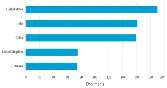 The productivity rate of authors and organizations is strongly influenced by the research policy and developmental focus of their host countries. Typically, the countries provide the necessary enabling environment for authors and organizations to perform their research. In turn, the nation benefits from the discoveries, publications, patents, and citations resulting from such research efforts. Figure 10 shows the top five countries actively involved in MLARE research based on the total number of published documents over the 12 years. The findings indicate that the top five countries have produced 660 published documents (54.19% of TP or 132 on average). The most prolific country is the United States with 189 published documents, followed by India and China with 162 and 158, respectively. The United Kingdom and Germany come in fourth and fifth places with 151 published documents cumulatively. The high productivity of these nations could be attributed to the growing importance and applications of the ML and RE sector of the global energy economy. Many studies have emphasized the importance of ML in the growth and development of RETs, particularly in the areas of energy materials design, parametric optimization, and performance prediction, among others. The applications of ML in RE are thus expected to grow in the coming years, resulting in an even higher number of publications, citations, collaborations, products, and patents in MLARE research.