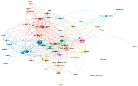 The impact of collaboration on the productivity rate of the top five countries on the topic was examined using the co-authorship analysis feature of VOSviewer. Figure 11 shows the network visualization of co-authorship links among countries actively engaged in MLARE research globally. The map shows that 62 out of the 110 countries that fulfilled the set criteria of a minimum of three documents that have been cited three times have active collaborations or links with each other. The findings indicate a high rate of co-authorship (>60%) and collaboration among nations involved in MLARE research.