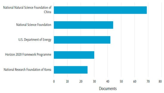 The availability/access to funding is the bedrock of successful research endeavors. Research funding helps researchers to acquire all the necessary resources to successfully carry out research, publish papers, travel, and equip their institutions with the tools necessary to compete with their peers globally. Hence, the growth and development of any research discipline are largely influenced by financial support from funding agencies []. The top funding agencies actively financing MLARE research are presented in Figure 12. As can be seen, the top five funding agencies on the topic have produced 209 (or 41.8 on average) published documents accounting for 17.16% of the total over the years. The most productive funder is the National Natural Science Foundation of China (NSFC) with 68 (or 5.58% on average) published documents on the topic. The funding activities of the NSFC have greatly aided in positioning Chinese authors and institutions at the forefront of MLARE research. In the second and third places are the US-based funders National Science Foundation (44 or 3.61% of TP), and the Department of Energy (42 or 3.45% of TP). Other notable funders are the Horizon 2020 Framework Programme of the European Union and the National Research Foundation of Korea with 30 and 25 published documents, respectively.