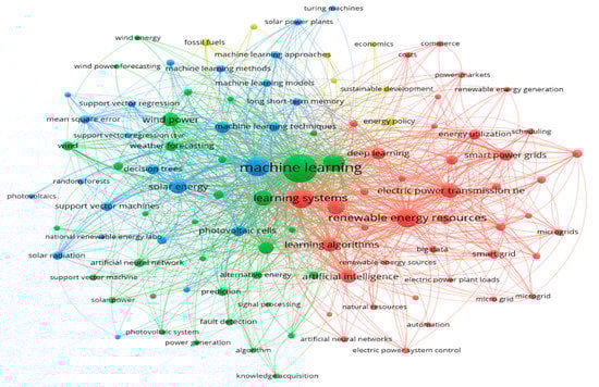 The analysis of the occurrence of related keywords is an important feature of the bibliometric analysis of any given area of research []. It is considered an integral indicator of the research themes, hotspots, or clusters peculiar to that research area [,]. In this study, the co-occurrence of keywords on MLARE research was examined using VOSviewer software according to the following criteria. Figure 13 shows the network visualization map of collaborating countries in MLARE research. The search term was based on the minimum of 25 occurrences per keyword, which resulted in 107 keywords out of the possible 8131 keywords. The network map shows MLARE consists of four clusters (comprising 7 to 41 keywords) that denote the various research themes or hotspots on the topic. As can be observed, the highest occurring keywords are machine learning (770), learning systems (373), and forecasting (360). The highest TLS was observed for machine learning (5095), followed by forecasting (3057) and learning systems (2917), which indicates that these are the most influential keywords on the topic. Further analysis shows that the largest (red) cluster consists of KWs such as Big Data, Mircogrids, and Power markets, among others, whereas the smallest cluster (lime green) has Climate Change, Fossil fuels, Global warming, and Investments, among others.