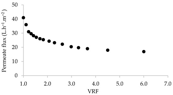 The permeate flux presented a logarithmic decrease with a TMP of 2.4 bar during the concentration experiments of the SCB alkaline extract. At the beginning of the concentration, the flux was 41 L·h−1·m−2, and dropped to 17 L·h−1·m−2 at a VRF of 6.0 (Figure 2). The flux dramatically decreased at the beginning of the concentration due to the apparition of the polarization layer adding a resistance to the membrane resistance. After the stabilization of the layer, the flux progressively decreased. This may be due to the viscosity changes of the solution and/or an increase in the osmotic pressure and/or the progressive fouling of the membrane [10], but these hypotheses would have to be confirmed. Besides, the membrane fouling could be responsible by several mechanisms, such as adsorption of molecules in the pores of the membrane blocking the pores, or cake formation on the surface of the membrane. Moreover, the membrane could be fouled by polysaccharides [22] and lignin [23], and hydrophobic extractives [24]. Jonsson et al., in several publications, also demonstrated the impact of the presence of AIL complexes that form either a layer or a pore fouling during ultrafiltration. A liquid/solid pre-treatment by centrifugation therefore allowed the filtration fluxes to be improved [10,13,25,26].