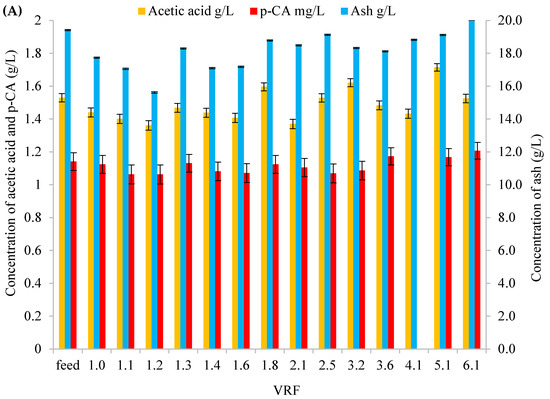 (A) Concentration of acetic acid, p-CA, and ash in the feed and in the permeates collected during the concentration; (B) Evolution of the concentration of dry solid (DS) content, xylan, AIL, and ASL in the permeate.
