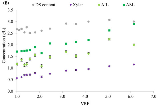 During the concentration experiment, the retention rates of ash, acetic acid, and p-CA were close to 0% (Figure 3A). The same trend was observed with vanillic acid, 4HBA, vanillin, and FA, but since their concentrations were much lower, they were not reported in Figure 3. This low rejection rate combined with the high retention of AIL and xylan led to an increase in the purity of these latter molecules. The concentration of AIL, ASL, and xylan increased in the permeate with increasing VRF (Figure 3B). This observation could be due to the increase in the concentration gradient between the feed stream and the permeate stream, inducing a higher dragging force by diffusion [27].