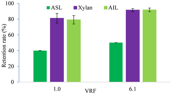 Retention rate of ASL, xylan, and AIL at the beginning (VRF = 1.0) and at the end of the concentration (VRF = 6.1).
