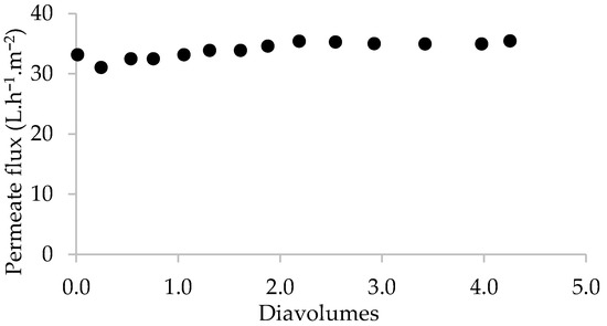 Diafiltration was directly run on another batch of SCB alkaline extract (5 L) on the same extraction conditions and not on the concentrated SCB alkaline extract in order to study the effect of running it potentially before the concentration mode. After a small decrease down to 31 L.h−1.m−2 at the beginning, the permeate flux slightly increased during the diafiltration, from 33 to 35 L.h−1.m−2 after 4.25 diavolumes of water were added (Figure 5). The flux increase could be a result of the viscosity decrease when the concentration of small molecules was reduced. In the research of J. Thuvander et al. (2020), the same trend of flux and the impact of viscosity were also indicated [27].