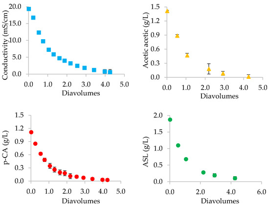Evolution of the conductivity (reflecting the ash concentration) and the concentrations of acetic acid, p-CA, and ASL in the permeate during the continuous diafiltration vs. added diavolumes.