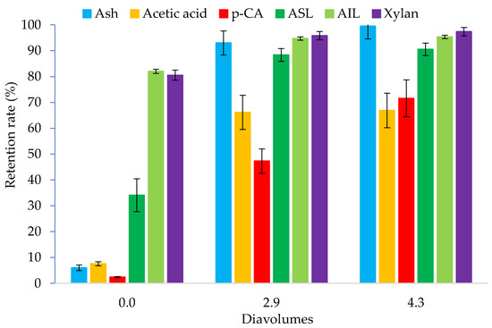 During the concentration experiment, the retention rate of both AIL and xylan increased by about 10% to reach 92% at a VRF of 6.1 (Figure 4). Due to the wide range in the size of these molecules, the small ones were washed out, leading to the increase in the mean molecular size, then increasing the concentration of molecules [26]. The retention rates of ash, acetic acid, and p-CA remained stable as their concentration did not significantly change from the beginning to the end of the experiment in both the permeate and the retentate.