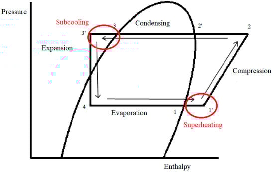 Sub-cooling could be identified as decreasing the refrigerant temperature below its condensing temperature at a specific pressure. On the other hand, superheating increases the refrigerant temperature above the boiling temperature at a specific pressure. Figure 3 shows the effect of superheating and sub-cooling on the cycle capacity and the system COP. Sub-cooling is commonly increased in three main ways: