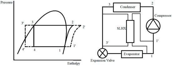 The suction line heat exchanger is used to exchange heat between the expansion device inlet (sub-cooling) and the compressor inlet (superheating) to improve the system efficiency by increasing the evaporator capacity. On the other hand, applying a SLHX in the refrigeration cycle elevates the compressor inlet vapor temperature, decreasing the volumetric compressor efficiency and affecting the system efficiency. Thus, optimisation is required to achieve the best outcome when using a SLHX. Domanski et al. [12] investigated the benefits of using a SLHX with different refrigerants with variable operating conditions. The study showed that the refrigerant thermodynamic properties highly influence the COP of the system. Figure 4 shows a diagram of the VCC with a SLHX and the effect of using the SLHX on the capacity of the VCC, as represented in the enthalpy/pressure chart; it is clear that using a SLHX results in increasing the system cooling capacity with a minor impact on the compressor volumetric efficiency. However, the impact of the SLHX on the cycle depends on the refrigerant properties and does not provide a similar result for all refrigerants [13].