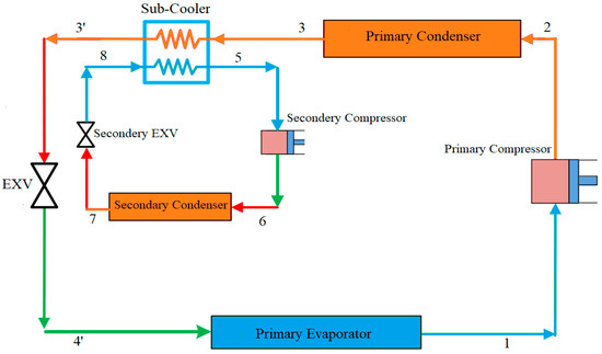 Mechanical sub-cooling aims to improve the cooling capacity using a small mechanical cooling system. As shown in Figure 5, the secondary cooling system cools down the refrigerant prior to the expansion stage to enhance the system’s efficiency. Thornton et al. [23] applied a mechanical cooling system to a supermarket refrigeration system and reported a 10% COP enhancement over a range of variables that were relevant to that particular application, which is remarkable; however, the authors did not discuss the feasibility of the proposed system over its lifetime. In another study, Khan and Zubair [24] investigated the effect of integrating mechanical sub-cooling after the condenser on the COP of the refrigeration cycle. They reported an improvement of 7.5% in the system COP. In 2012, Qureshi and Zubair [25] investigated the performance of different refrigerant combinations in the primary and sub-cooling refrigeration cycles with mechanical subcooling. The authors of this study concluded that the best COP was achieved when R-134a was used in the primary cycle, but more refrigerants could be tested in the future to find the best combination. She et al. [26] applied an expander in order to drive the sub-cooling refrigeration cycle, which yielded a 19% improvement in the primary cycle COP compared to conventional mechanical sub-cooling. In addition, the study proposed R-744 for the primary cycle and R-12 for the sub-cooling cycle. However, due to the high ODP of the R-12, other refrigerants could be used as more environmentally friendly options, including HFOs or natural refrigerant options.