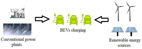 In [7,8], the total life-cycle greenhouse gas (GHG) emissions produced by passenger cars were investigated. The results showed that combustion engine vehicles emit the highest amount of GHG emissions, while BEVs can reduce these emissions by 89%. In [9,10,11], the impact of EVs on the emissions inside the European Union was investigated. The results showed that these emissions will not be reduced if fossil fuels still have a significant share in the power mix. The emissions of BEVs in Poland were investigated in [12,13,14]. The results show that the emissions are comparable with those of conventional combustion vehicles due to the high share of fossil fuel power plants in the power mix. A comparison of the CO2 emissions for PHEVs and BEVs was performed in [15]. In [16], the charging infrastructure, technology, and issues related to charging station identification were reviewed. The losses during charging were investigated in [17], with the losses being higher for single-phase charging (20.42%) when compared to three-phase charging (12.79%).