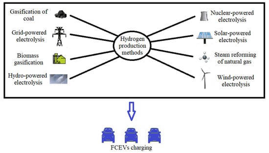 Hydrogen is a secondary energy carrier, which can be produced using various energy sources (e.g., gas, nuclear, and renewable) and production methods (e.g., steam reforming of natural gas, coal gasification, and electrolysis) [19,27,28,42] (Figure 2). Additionally, each of these hydrogen production methods have an impact on the environment. Therefore, the BEVs and FCEVs has an impact on CO2 emissions due to the production of their fuel (power or hydrogen).