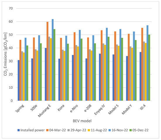 When it comes to the BEV model, the Spring, which has low fuel consumption, had the lowest CO2 emissions per kilometer, while the Mustang Mach-E RWD, with high fuel consumption, had the highest CO2 emissions per kilometer. If the emissions during a year are compared, then the Mustang is 29.6% more pollutant than the Spring. If one full charge of a battery is considered, then the lowest CO2 emissions are found for the Fiat 500 electric, which has the smallest battery and charges faster compared to the other models. Additionally, the highest CO2 emissions were found for the Tesla Model S, which has the biggest battery and requires more time to charge.