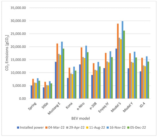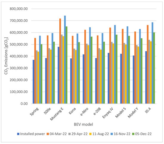 The total CO2 emissions for a year considering the number of BEVs (10,000 Dacia Spring and 13,221 vehicles from other manufacturers) are as follows: 9,198,773.38 kgCO2 (considering the installed power of the power plants), 13,772,045.40 kgCO2 (considering the power supplied on 4 March 2022), 11,183,416.44 kgCO2 (considering the power supplied on 29 April 2022),10,914,829.05 kgCO2 (considering the power supplied on 11 August 2022), 14,244,468.85 kgCO2 (considering the power supplied on 16 November 2022) and 12,491,691.11 kgCO2 (considering the power supplied on 5 December 2022).