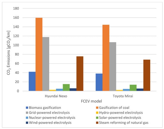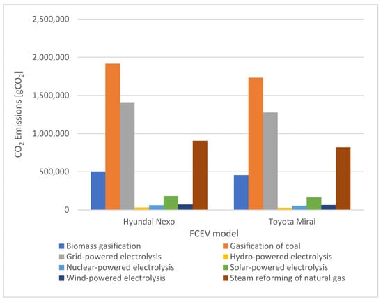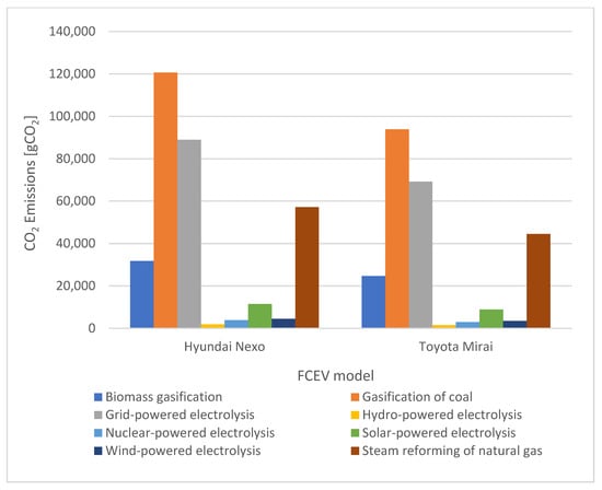 Nexo, which has higher fuel consumption when compared to the Mirai, had higher CO2 emissions. When the hydrogen was obtained via the gasification of coal, the CO2 emissions were the highest. When the hydrogen was obtained via hydro-powered electrolysis, the CO2 emissions were the lowest.