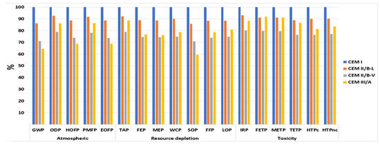 The impacts of each environmental impact category were calculated using different units to make it easier to compare the different scenarios. Table 2 presents the comparative characterization results of 1 kg of CEM I, CEM II/B-L, CEM II/B-V, and CEM III/A at the midpoint method. The impact categories studied in this work were divided into three impact groups (atmospheric, resource depletion, and toxicity) in order to enable visual analysis of the results. The atmospheric impacts consist of GWP, PMFP, ODP, EOFP, and HOFP, whereas resource depletion impacts include TAP, FEP, MEP, FFP, SOP, WCP, and LOP, and toxicity includes IRP, TETP, FETP, METP, HTPc, and HTPnc.