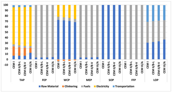 Fuel usage (38% in CEM I to 38% CEM II/B-L, 38% in CEM II/B-V, and 36% in CEM III/A), transportation (31% in CEM I to 29% CEM II/B-L, 28% in CEM II/B-V, and 27% in CEM III/A), and raw materials (31% in CEM I to 32% CEM II/B-L, 33% in CEM II/B-V, and 37% in CEM III/A) are the major contributors to LOP. Electricity is the highest contributor to TAP (68% in CEM I to 70% CEM II/B-L, 71% in CEM II/B-V, and 72% in CEM III/A) and the clinkering stage also contributes (17% in CEM I to 15% in CEM II/B-L and CEM II/B-V, and 9% in CEM III/A). In this study, raw materials and fuel usage are the main contributors to eutrophication impacts (FEP and MEP). This result is similar to those from studies in Brazil [109], Spain [103], and Southern Europe [48], which showed that clinkering and electricity usage significantly impact FEM and MEP.