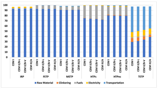 The results show that raw materials contribute the most significantly regarding toxicity impact categories, as shown in Figure 5. Raw materials contribute 93% in CEM I, CEM II/B-L, CEM II/B-V, and CEM III/A to FETP and IRP; 91% in CEM I, CEM II/B-L, CEM II/B-V, and CEM III/A to METP; 80% in CEM I, CEM II/B-L, CEM II/B-V, and CEM III/A to HTPnc; and 75% in CEM to 74% in CEM II/B-L and CEM II/B-V, and 72% in CEM III/A to HTPc. However, transportation (49% in CEM I to 47% in CEM II/B-L, 45% in CEM II/B-V, and 42% in CEM III/A) and raw materials also contribute (30% in CEM I to 31% in CEM II/B-L, 34% in CEM II/B-V, and 39% in CEM III/A) to TETP. These results were attributable to the significantly high material usage and direct air emission. This study shows that the raw materials stage mainly contributes to TETP, METP, and FETP. This result is similar to those of studies in Turkey [110] and Brazil [109] regarding cement production. This study also shows that raw materials contribute to HTPc and HTPnc. This result aligns with a study by Palermo et al. [109], compared to the studies by Çankaya & Pekey [110] and García-Gusano et al. [103] that showed electricity usage contributes mainly to HTPc and HTPnc.
